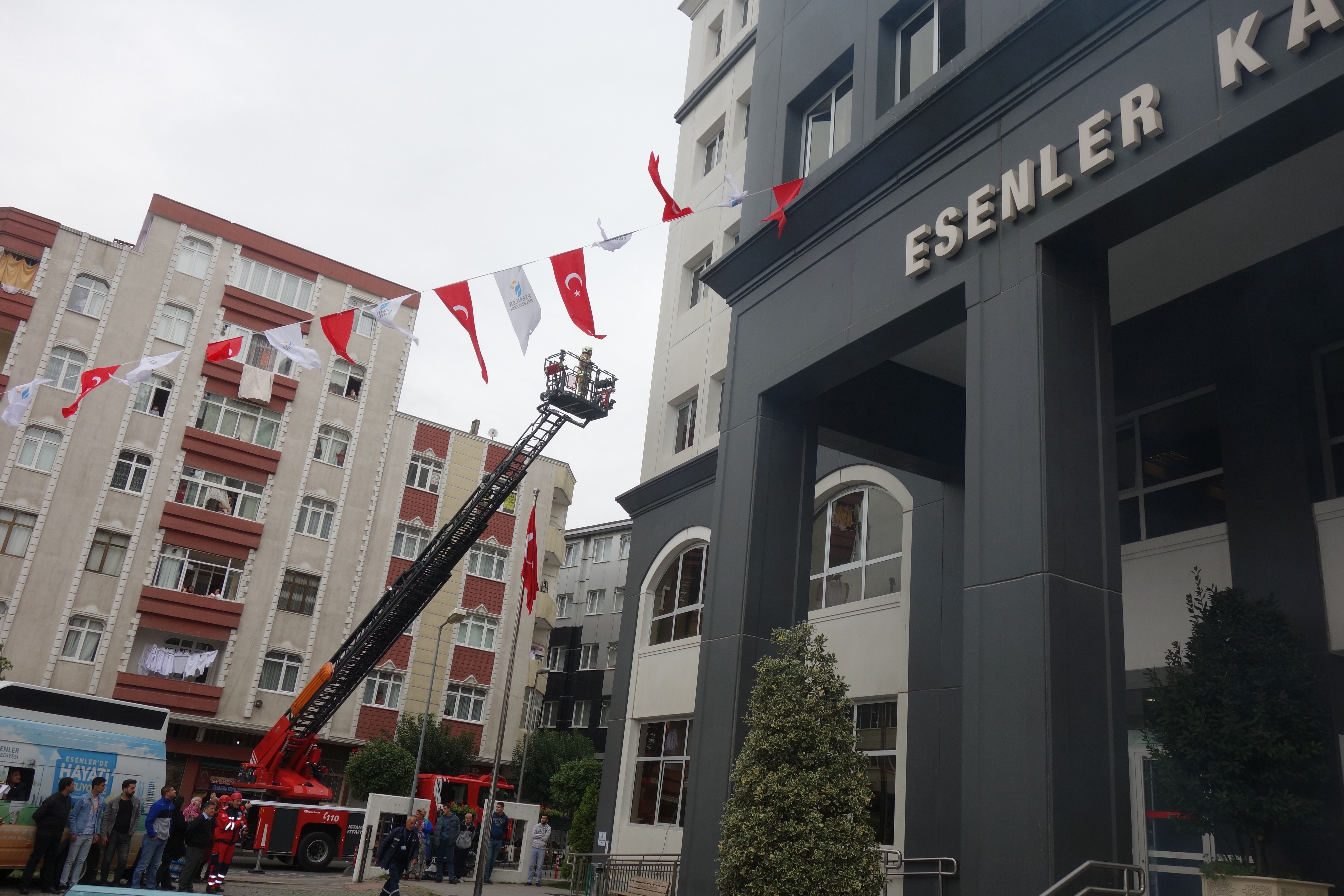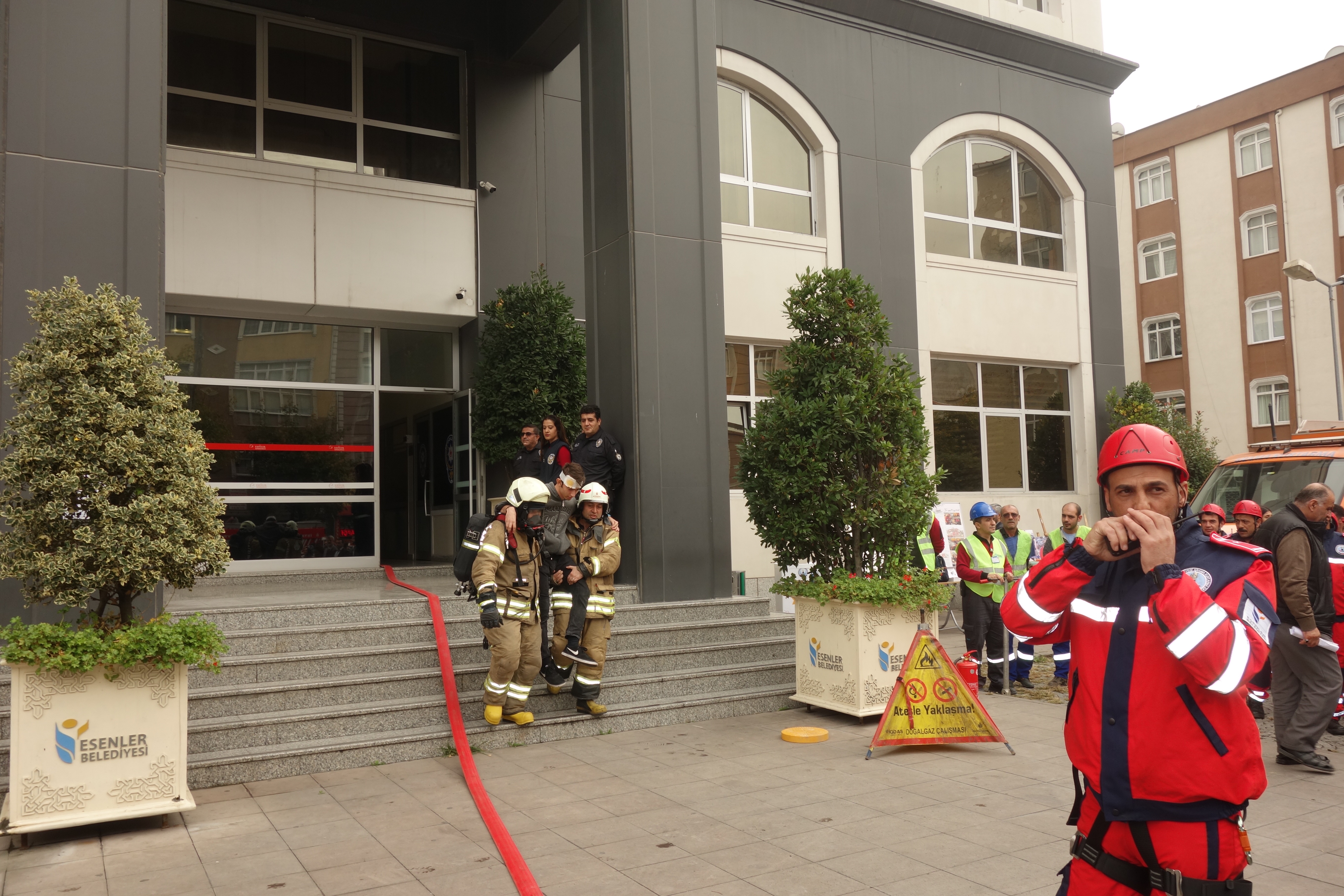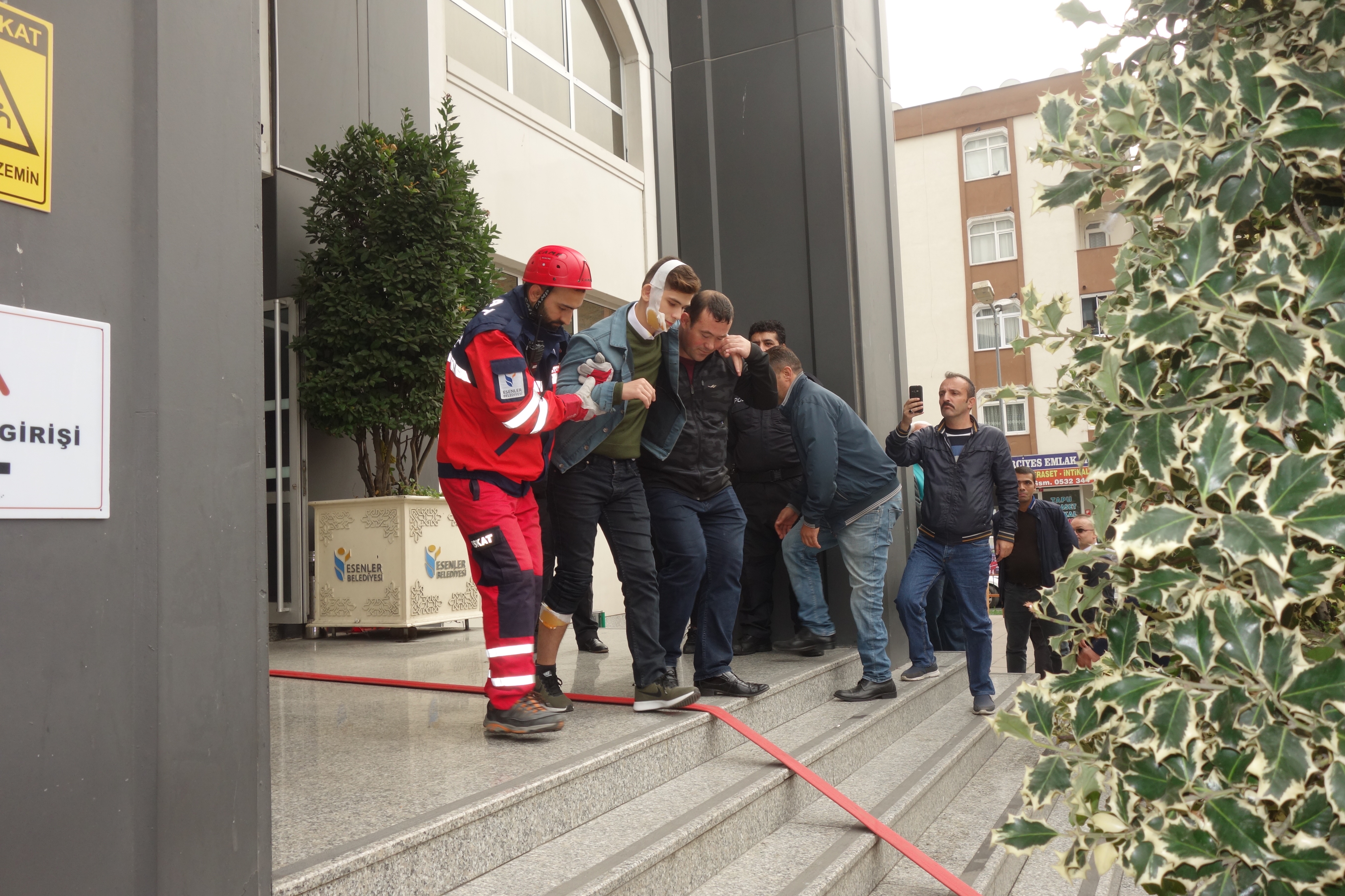 Esenler Belediyesi tarafından Esenler Hükümet Konağı’nda yapılan 6.5 büyüklüğündeki 30 saniye süren depremin ardından tahliye ve arama kurtarma tatbikatı gerçeğini aratmadı. Yaralılar sedyelere konarak pencereden halatlarla sarkıtılarak indirildi.