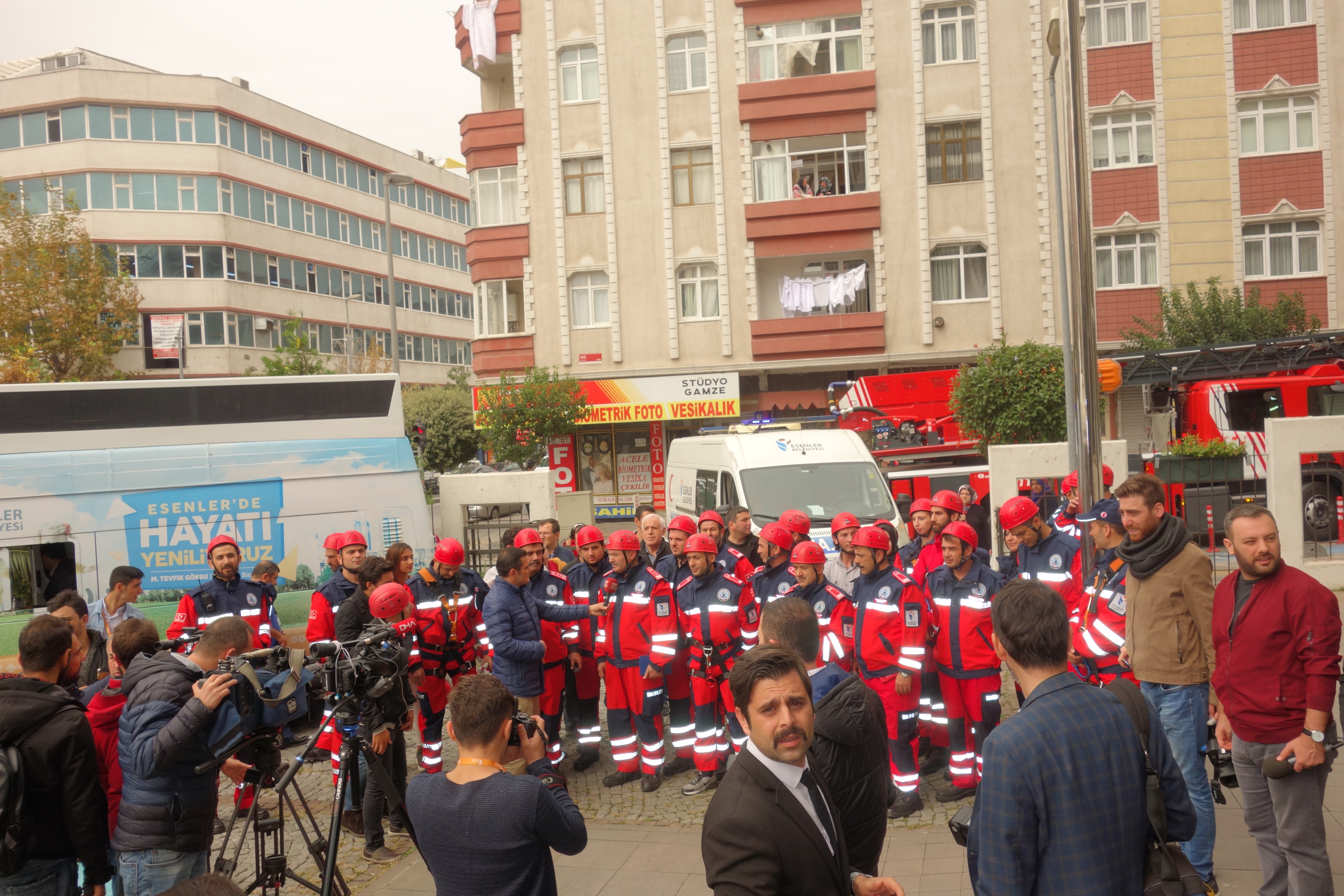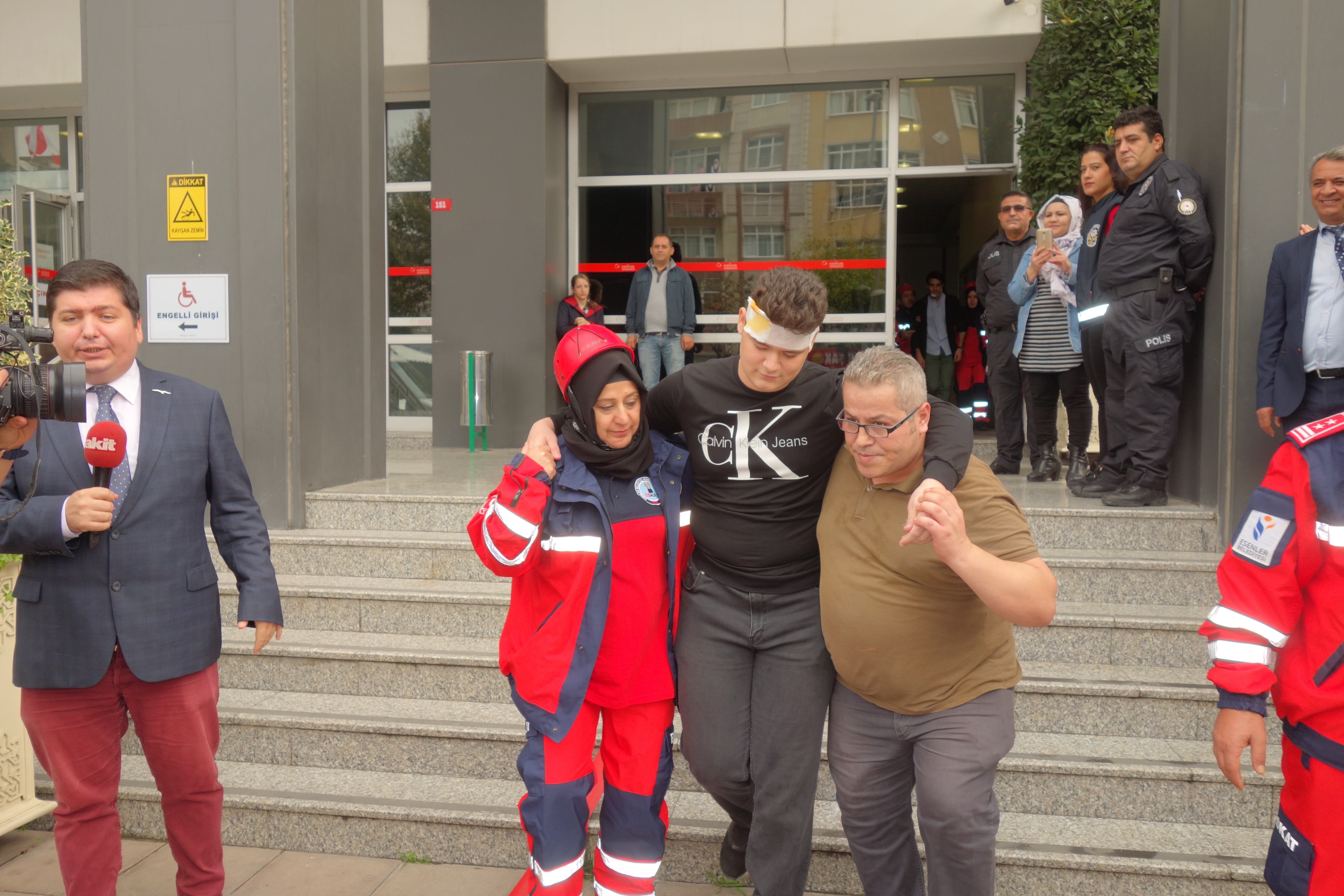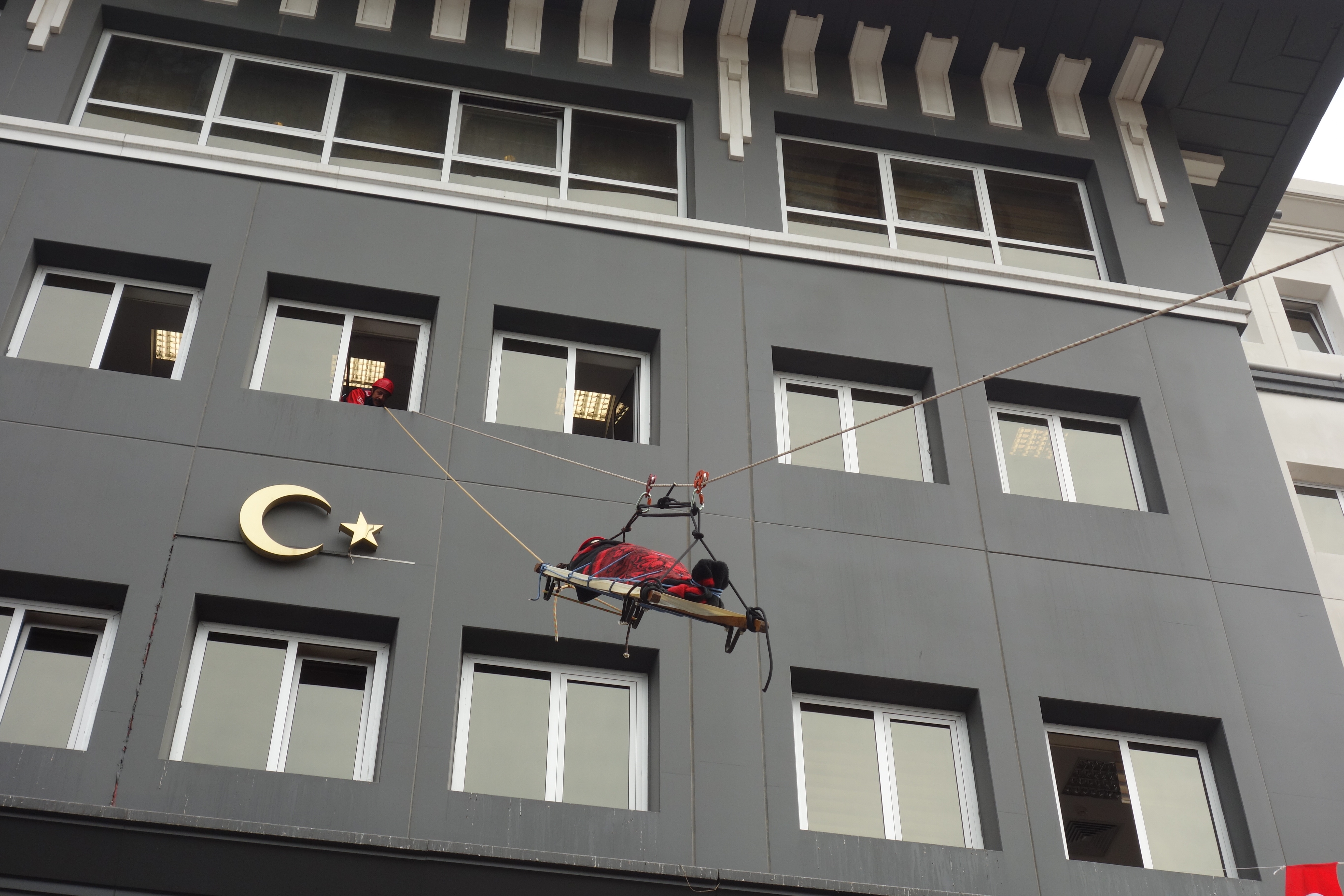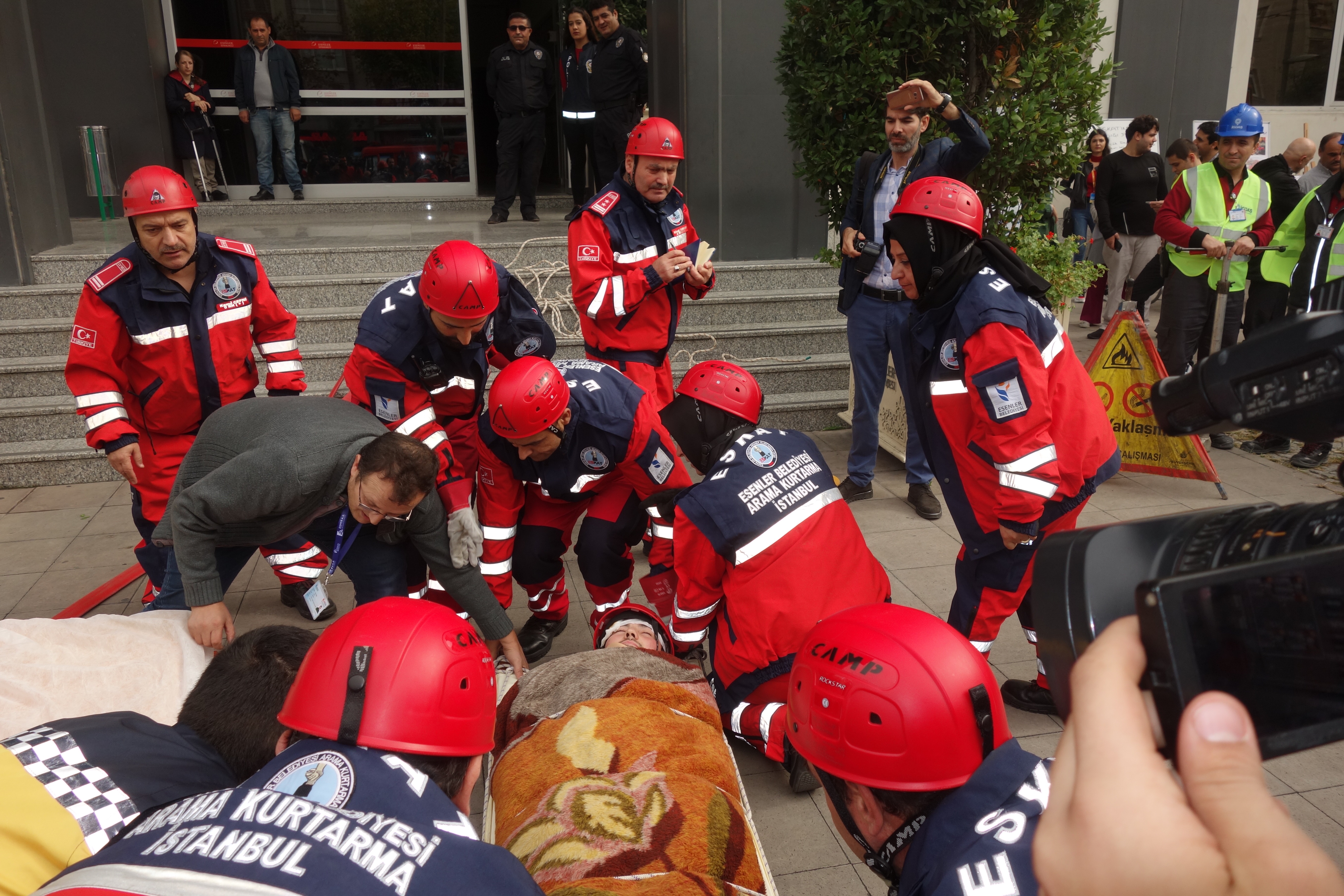 Esenler Belediyesi tarafından Esenler Hükümet Konağı’nda yapılan 6.5 büyüklüğündeki 30 saniye süren depremin ardından tahliye ve arama kurtarma tatbikatı gerçeğini aratmadı. Yaralılar sedyelere konarak pencereden halatlarla sarkıtılarak indirildi.