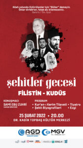 Şubat ayı içerisinde birçok önemli şahsiyetin şehadeti nedeniyle Şubat ayının şehitler ayı olduğunu belirten GÖMEÇ, Şehitler Gecesi programın bu yıl Filistin – Kudüs temasıyla gerçekleştireceklerini belirterek, Programa konuşmacı olarak Hamas Sözcüsü Sami Ebu ZUHRİ beyin katılım sağlayacağını bu vesileyle Erkek-Kadın tüm halkımızı Şehitler Gecesi programına davet ediyoruz ve katılımlarınızı bekliyoruz ifadelerini kullandı.