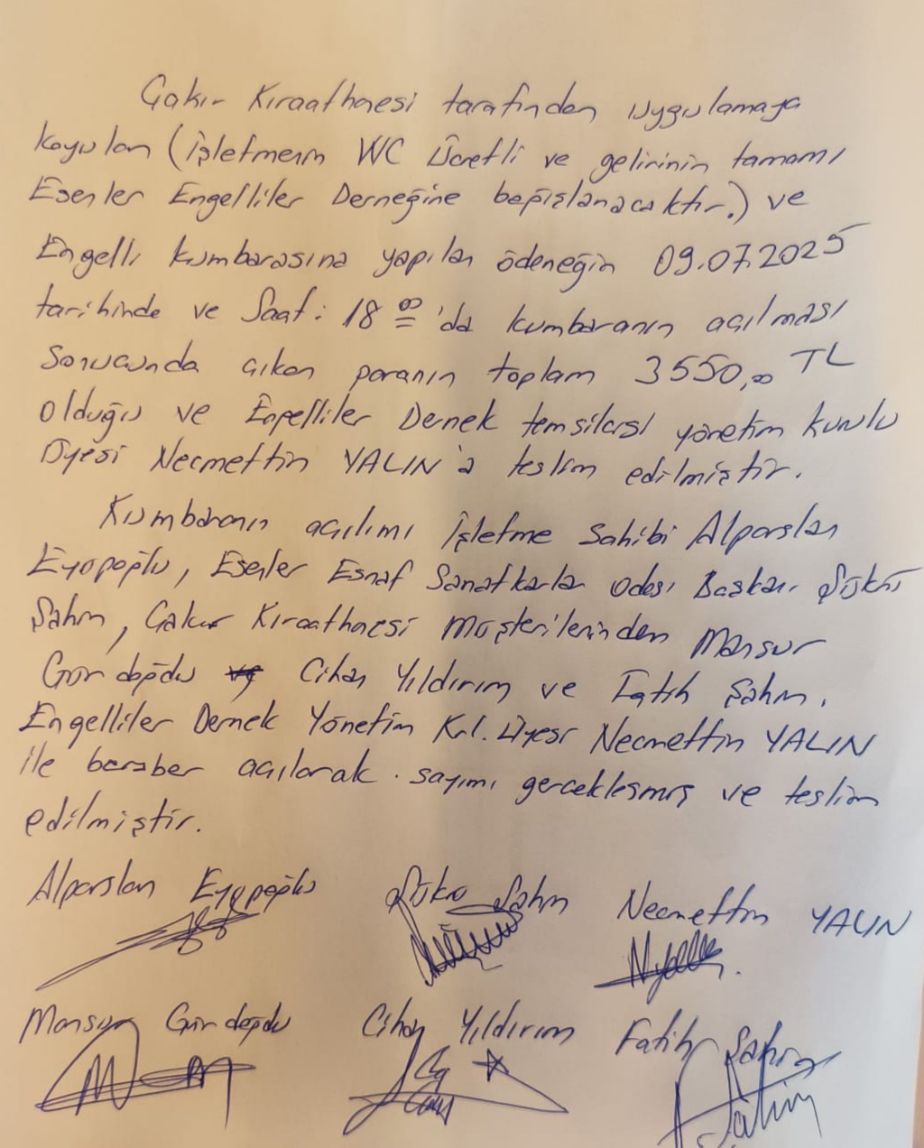Toplanan bağışların yer aldığı kumbaranın açılışı, kıraathane işletmecisi Alparslan Eyüboğlu’nun yanı sıra Esenler Esnaf ve Sanatkârlar Odası Başkanı Şükrü Şahin, kıraathane müşterilerinden Mansur Gündoğdu, Cihan Yıldırım ve Fatih Şahin ile Engelliler Derneği Yönetim Kurulu Üyesi Necmettin Yalın’ın katılımıyla gerçekleştirildi. Açılış sırasında sayımı yapılan 3. 550 liralık miktar, tutanak altına alınarak Engelliler Derneği’ne teslim edildi.