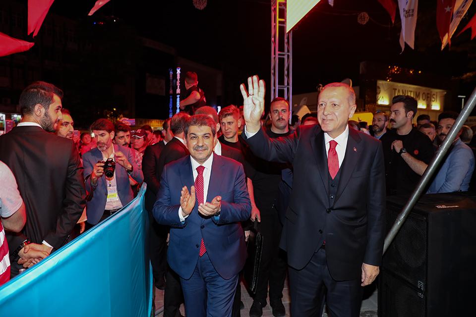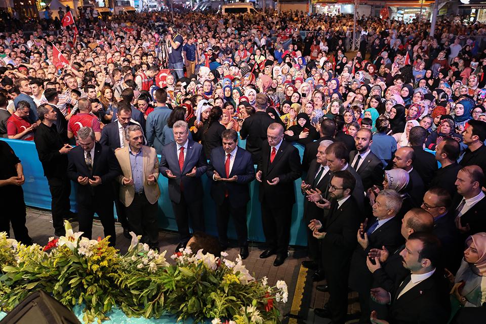 Dörtyol Meydanı’nı hınca hınç dolduran Esenlerlilerin tezahüratları eşliğinde konuşmasına başlayan Cumhurbaşkanı Recep Tayyip Erdoğan, Esenlerli vatandaşların Ramazan’ını ve Kadir Gecesi’ni tebrik ettikten sonra, “Kadir Gecesi’ni eriştiren, gönüllerimizi bu mübarek gecede buluşturan Mevla’ya sonsuz hamd-ü senalar ediyoruz. Esenler Belediye Başkanı ve ekibine bu anlamlı program için teşekkür ediyoruz. Sizlere de teşrifleriniz için şükranlarımı sunuyorum. Türkiye’nin ve dünyanın farklı köşelerinde Ramazanı idrak etmenin mutluluğunu yaşayan kardeşlerime şükranlarımı sunuyorum. Suriye’de, Yemen’de bir kuru ekmeği bulamayan masum çocuklara, Afganistan’da, Libya’da Ramazanı geçirmek zorunda kalan mazlumlara, Filistinli mültecilere buradan dualarımızı gönderiyoruz” diye konuştu.