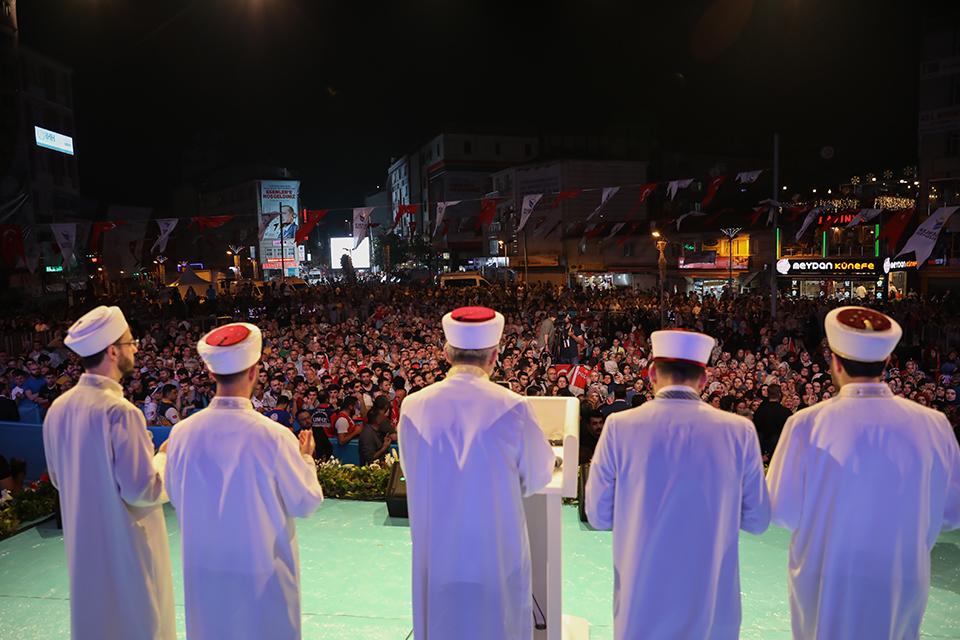 “Bütün Esenler’in, sesimizi duyan bütün kardeşlerimizin Kadir Gecesi’ni tebrik ediyorum. Kadir Gecesi’nde bütün insanlık sulh ve selamettedir. Bütün insanlık emniyettedir. İçerisinde bin aydan daha hayırlı bir geceyi Cenab-ı Hakk bugün bize ikram etti. Biz de bu ikramı bugün bu meydanda Esenler ile birlikte yaşıyoruz. Bugün bu meydanda yeryüzündeki insanlığın selameti, bereketi, vicdanının yeniden ayağa kalkması için duaya, secdeye ve kıyama duracağız. Esenler’de her Kadir Gecesi’nde gelenek haline gelen ’10 Bin Hatim 100 bin Dua’ programı çerçevesinde Esenler’deki her bir kardeşimizin evlerinde okunan on binlerde hatmin duasını burada yüz binlerce kardeşimizle beraber ellerimizi semaya açarak hep beraber yapacağız. Bu gece ellerimiz duada, alınlarımız secdede olacak. Bu şehirdeki her bir kardeşimizin, gönül kardeşliğini, sınır tanımaksızın kardeş olduğumuzu bütün insanlığa gösteren büyük dua buluşmasındayız. Duamızla beraber bütün insanlığa mazlumun dostu, zalimin hasmı olduğumuzu, kimsesizlerin kimi, mazlumların sesi olduğumuzu ve bunu herkesin böyle bilmesi gerektiğini bütün insanlara bildireceğiz.”