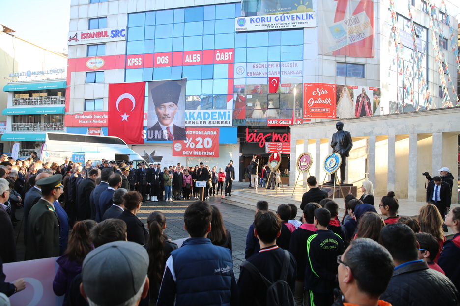 Türkiye Cumhuriyeti’nin kurucusu Gazi Mustafa Kemal Atatürk, ölümünün 80’inci yıldönümünde tüm yurtta olduğu gibi Esenler’de de anıldı. Dörtyol Meydanı’nda bulunan Atatürk büstüne çelenk sunumuyla başlayan anma töreninde Atatürk için saat 09.05’te, iki dakikalık saygı duruşuna geçildi ve ardından İstiklal Marşı okundu. Anma töreninde, Esenler Kaymakamlığı adına İstanbul Vali Yardımcısı Halil Serdar Cevheroğlu, Garnizon Komutanlığı adına Binbaşı Mustafa Figen ve Esenler Belediye Başkanı Mehmet Tevfik Göksu, Esenler Esnaf Odası Başkanı Şükrü Şahin siyasi parti temsilcileri, Kamu Kurum temsilcileri, Gaziler ve vatandaşlar katıldı. Daha sonra Atatürk büstüne çelenk bırakbırakılarak saygı duruşunda bulunuldu.