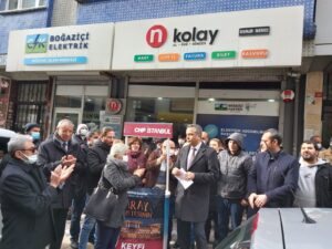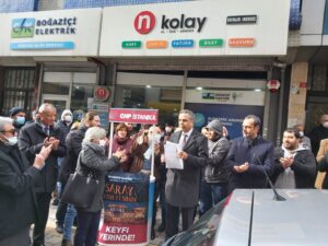İstanbul’un tüm ilçelerinde CHP İstanbul İl Başkanlığı tarafından eş zamanlı yapılan zamları protesto eden CHP Esenler İlçe Başkanlığı Dörtyol PTT karşısındaki Boğaziçi Elektrik fatura merkezi önünde CHP Esenler İlçe Başkanı Bülent Ütebay zamlar ile ilgili açıklama Basın açıklamasını okudu.