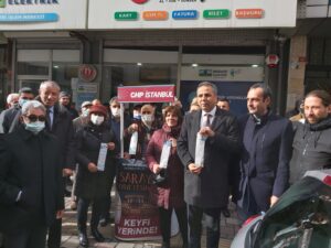 CHP İstanbul İl başkan yardımcısı, ilçe yöneticileri, belediye meclis üyeleri ve partililerin de katıldığı basın açıklamasına ilçe yöneticileri ellerinde zamlı faturaları göstererek “Zamlar geri çekilsin eziyete son verilsin” diyerek zamları protesto ettiler.