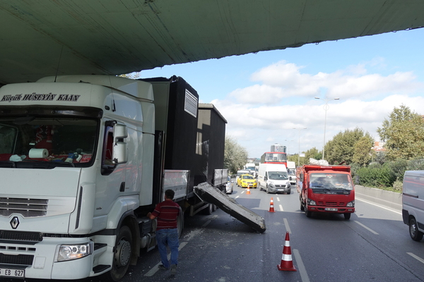 Esenler’de seyir halindeki tırın alt geçide çarpması sonucu tırda hasar oluştu.