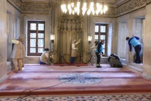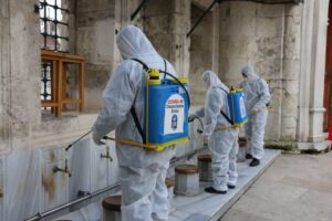 Yüzyıllardır Ramazan’ın en güzel şekilde yaşandığı, İslam aleminin gözbebeği Eyüpsultan’da Ramazan Ayı hazırlıkları kapsamında Eyüpsultan Camii Meydanı ve cami içerisi gül suyu ile yıkandı, temizlendi. Caminin içerisi, avlusu, abdest alma yerleri Eyüpsultan Belediyesi dezenfeksiyon ekipleri tarafından dezenfekte edildi.