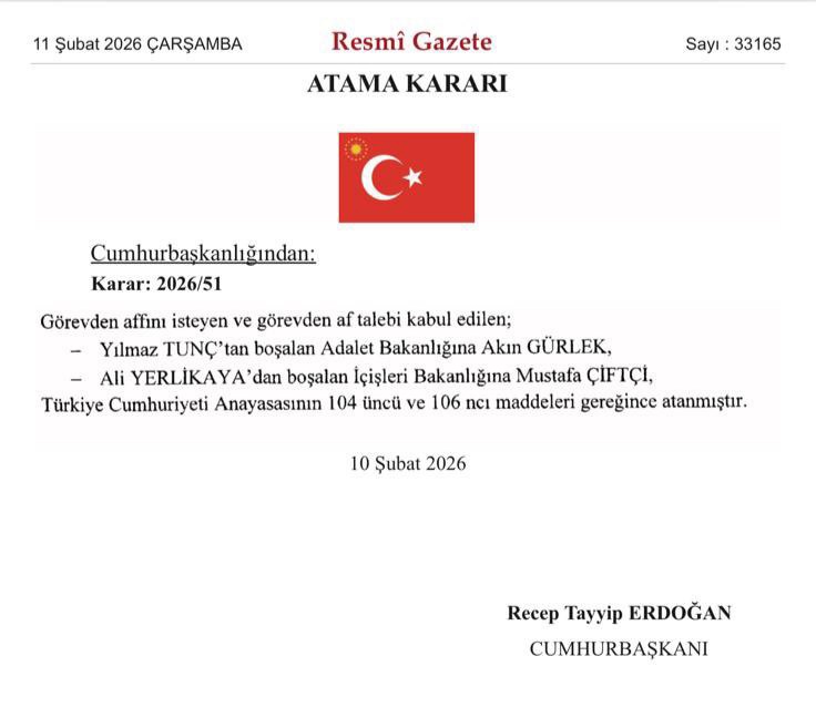 Görevden affını isteyerek ayrılan Adalet Bakanı Yılmaz Tunç’un yerine İstanbul Cumhuriyet Başsavcısı Akın Gürlek atandı. İçişleri Bakanı Ali Yerlikaya’nın yerine ise Erzurum Valisi Mustafa Çiftçi getirildi.