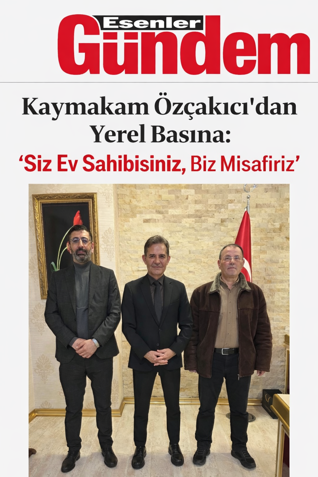 Esenler Kaymakamı Süleyman Özçakıcı, makamında ESENLER GÜNDEM Gazetesi imtiyaz sahibi Sait Yılmaz ve Avas Haber Gazetesi imtiyaz sahibi Serkan Basut’u ağırladı. İlçenin güncel durumunun konuşulduğu ziyarette Özçakıcı, birlik ve beraberlik mesajı verdi.